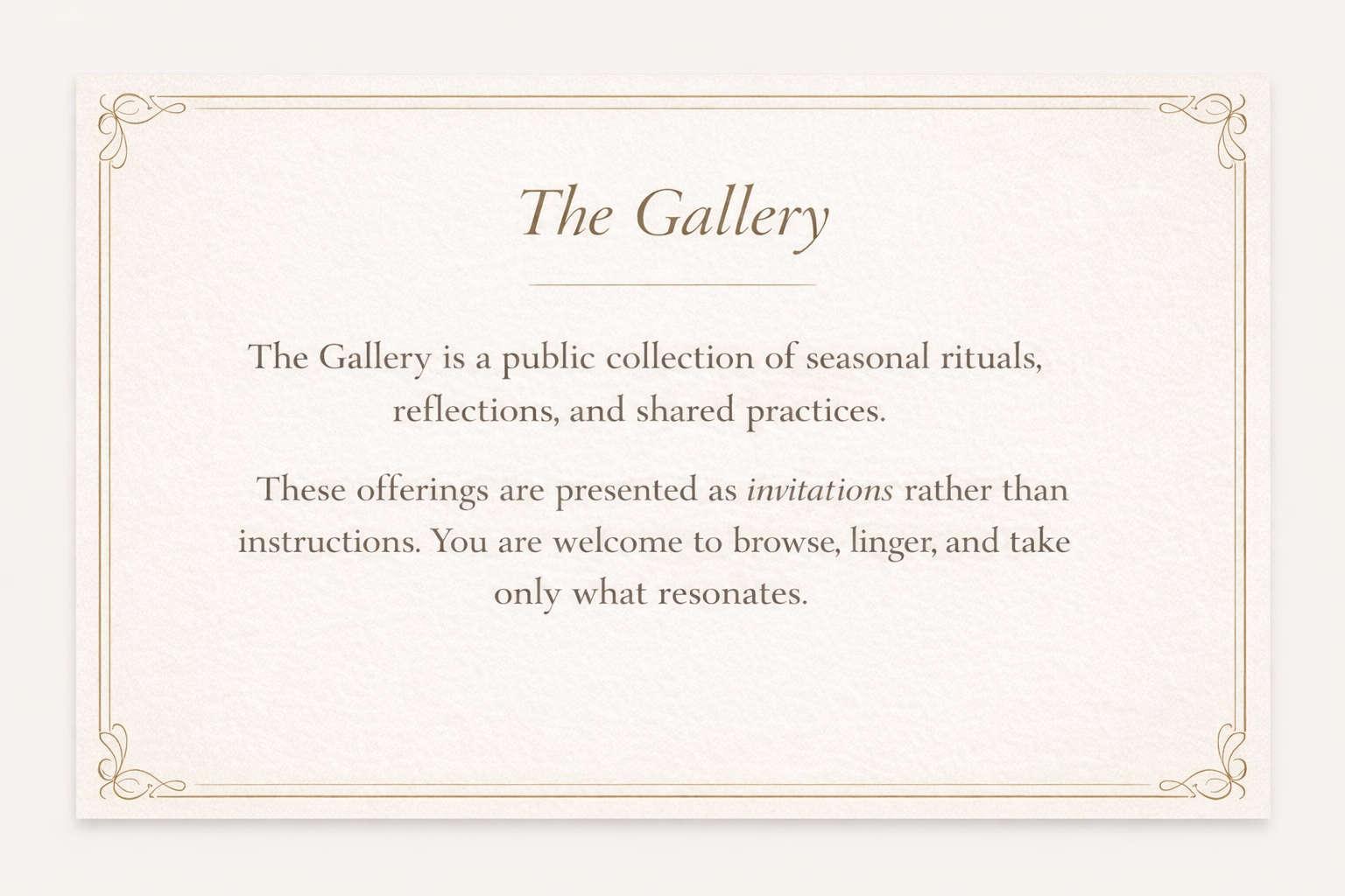 The Gallery is a public collection of practices, reflections, and seasonal rituals.